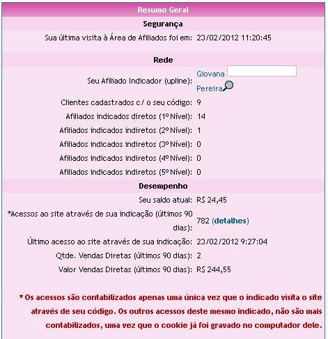 Meu painel no escritório virtual do Imagem Folheados, no qual consta os clientes que foram cadastrados em meu código de afiliados, e meus afiliados diretos e indiretos.